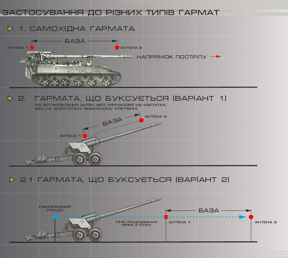 GNSS navigation solutions can be used on any artillery systems, allowing to determine: current coordinates, true azimuth, angular orientation in space (angle of location of baselines between antennas, direction angle, and angles of actual direction to the target, in case of ballistic calculation option) , velocity vector, and parameters of the state of the time scale.